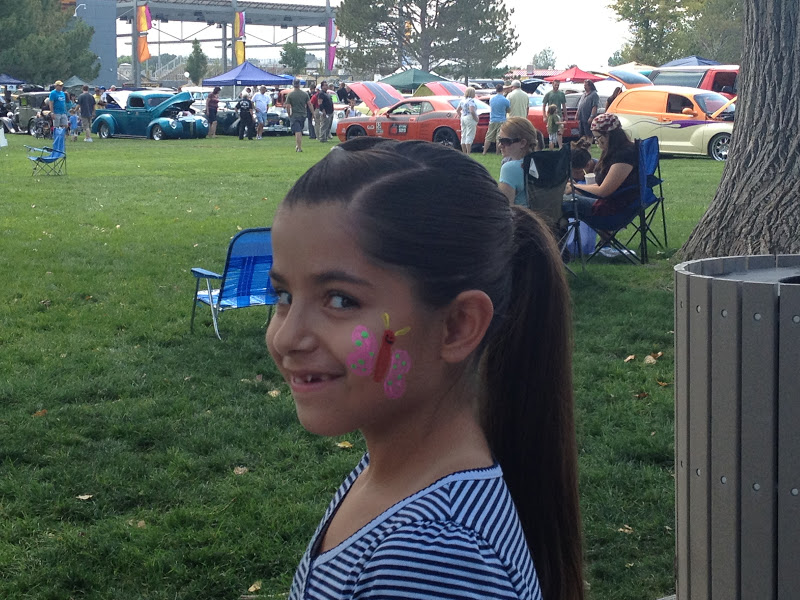 We went to a car show today. It was a ton more fun than I was expecting. The kids got to have their faces painted, play some games and win prizes and they got to choose a stuffed animal to keep. We got to see a ton of really awesome cars. I think this is the first car show with many to come. Enrique's his first car was a '70 Mustang so one day he will have it again, today didn't help but he really enjoyed himself. We were there for several hours and we all had a great time. Thanks Papi for a great family date!